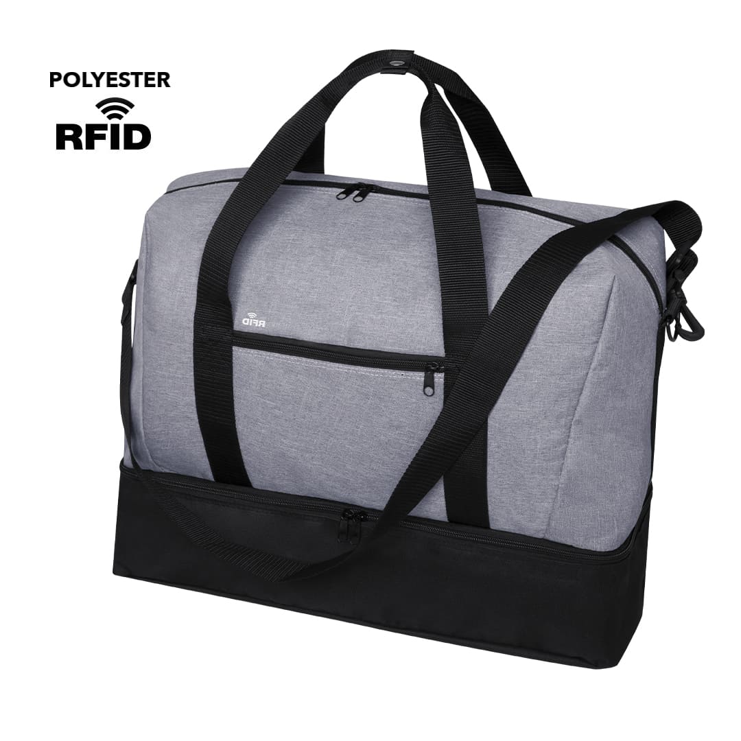 Borsone multiuso in poliestere 600D con finitura denim, ideale per un look urbano. Dotato di tasca con tecnologia di sicurezza RFID per proteggere i dispositivi di trasmissione delle identità. Include uno scomparto separato con cerniera per calzature e una tasca laterale con zip. Il comparto principale è dotato di chiusura a zip a doppio tirante, mentre le maniglie rinforzate con chiusura a bottone e il rinforzo in nylon garantiscono resistenza. La tracolla è regolabile per un trasporto comodo. Dimensioni: 50 x 38 x 24 cm. Perfetto per chi cerca praticità e sicurezza.