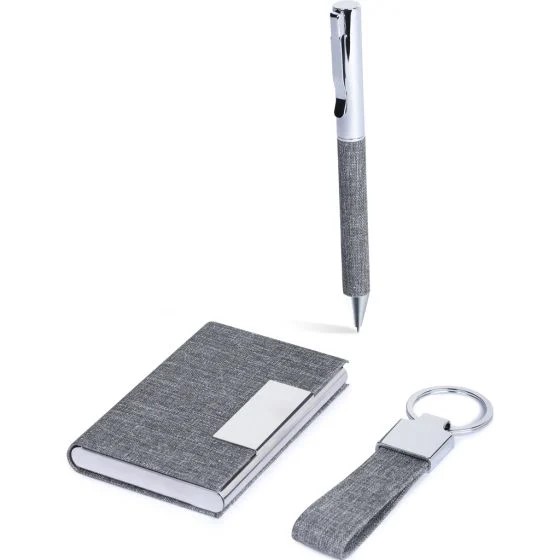 Il set scrittura è composto da una penna a sfera in metallo con rivestimento in RPET, dotata di chiusura a rotazione e refill nero, un portachiavi in metallo e RPET, e un portabiglietti da visita in metallo con rivestimento in RPET e interno vellutato. Il tutto è presentato in un astuccio di cartoncino, ideale come regalo aziendale o promozionale. Con un design moderno, questo set è perfetto per chi ama scrivere con stile e distinguersi con accessori unici. Aggiungi un tocco di classe al tuo ufficio o regala un prodotto di qualità ai tuoi clienti con questo elegante set scrittura.